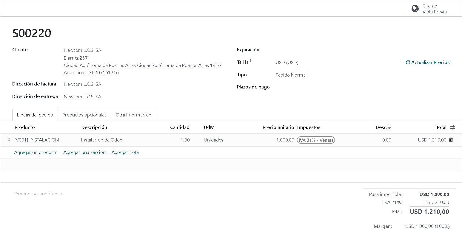 - Direccion de Entrega: Si es un proyecto o obra que se va a realizar en otra ciudad o provincia. Es necesario que este dada de alta la ubicación en los contactos.